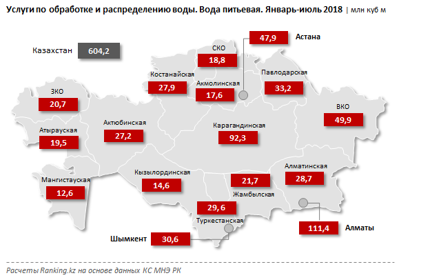По итогам 7 месяцев водохозяйственные компании по стране обеспечили казахстанцам 604,2 миллиона кубометров питьевой воды - чуть меньше (на 1 процент), чем годом ранее.