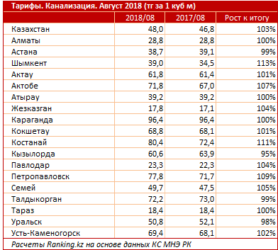 Услуги по отводу воды - канализации - достигли к сентябрю 48 тенге за кубометр, на 2,5 процента больше, чем год назад.