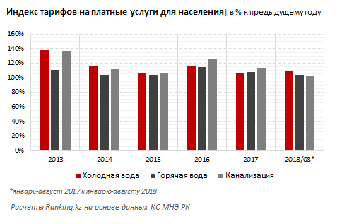 Так, по итогам прошедшего года холодная вода показывала удорожание год-к-году на 6,5 процента, горячая - на 7,4 процента, канализация - сразу на 13,2 процента.