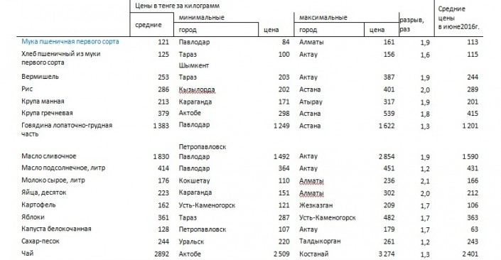 Средние цены на основные продовольственные товары в Республике Казахстан в июне 2017 года: