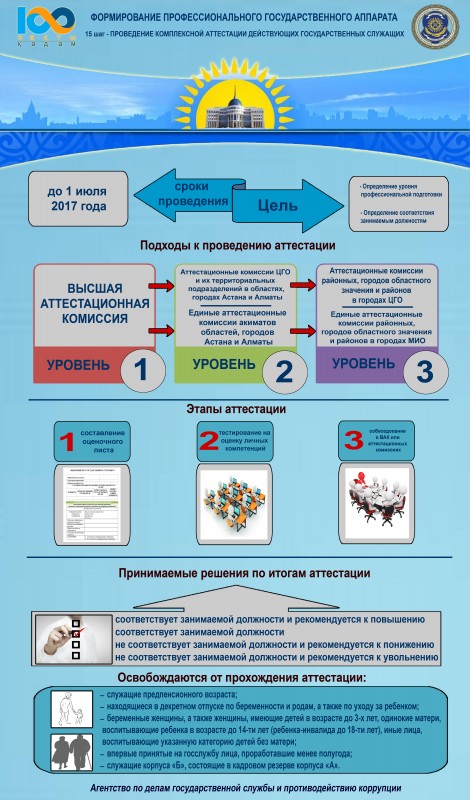 В настоящее время организована подготовительная работа, непосредственные этапы аттестации начнутся с 1 февраля и завершатся к 1 июля 2017 года. В отличие от аттестаций прошлых лет, нынешняя нацелена на определение уровня профессиональной подготовки и выявление потенциала служащих для дальнейшего развития.