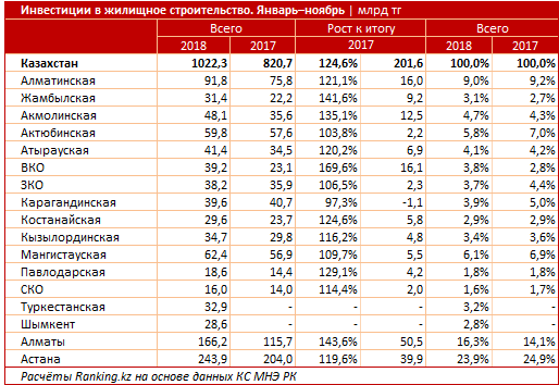 Если в среднем в инвестиционном портфеле Казахстана собственные средства бизнеса занимают 73 процента, то в строительном секторе их доля превышает 90 процентов. Это еще раз подчеркивает, что на текущий момент средства населения являются одним из основных источников фондирования для застройщиков.