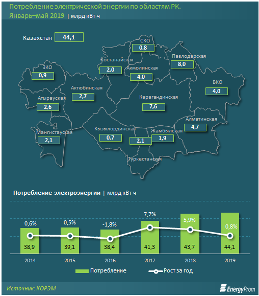 По данным КОРЭМ (Казахстанского оператора рынка электрической энергии и мощности), производство электроэнергии составило 44,1 миллиарда киловатт в час - на 5 процентов меньше, чем за аналогичный период годом ранее (46,4 миллиарда киловатт в час). Данные незначительно отличаются от данных Комитета по статистике МНЭ РК.