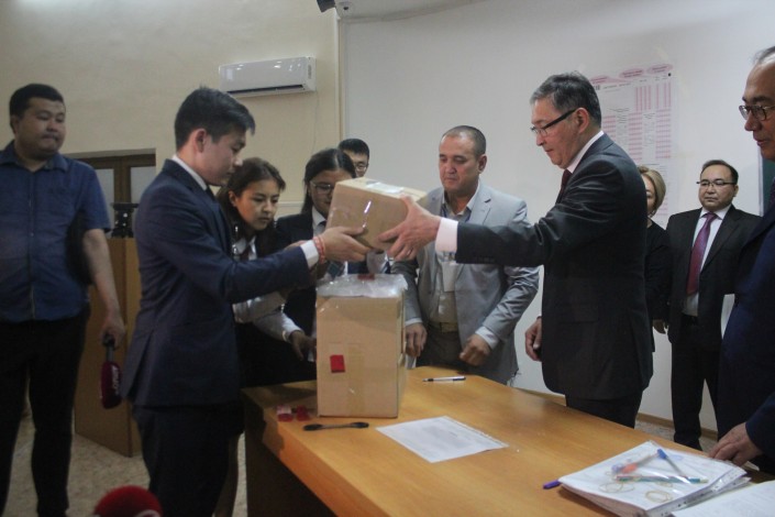 Первые участники ЕНТ вскрыли запечатанную коробку с тестами в торжественной обстановке вместе с министром. Тестовые тетради печатались в строгой секретности, целостность опечатанных коробок также тщательно проверяли. Вскрывать печати вызвались трое тестируемых, с которых позже взяли подписи, свидетельствующие о целостности печатей на момент вскрытия.