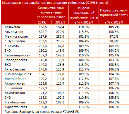 Среднемесячная номинальная заработная плата одного работника по РК за первый квартал 2019 года составила 168,5 тысячи тенге. Это 95,7 процента к прошлому кварталу, но при этом к первому кварталу 2018 года — 110,5 процента.