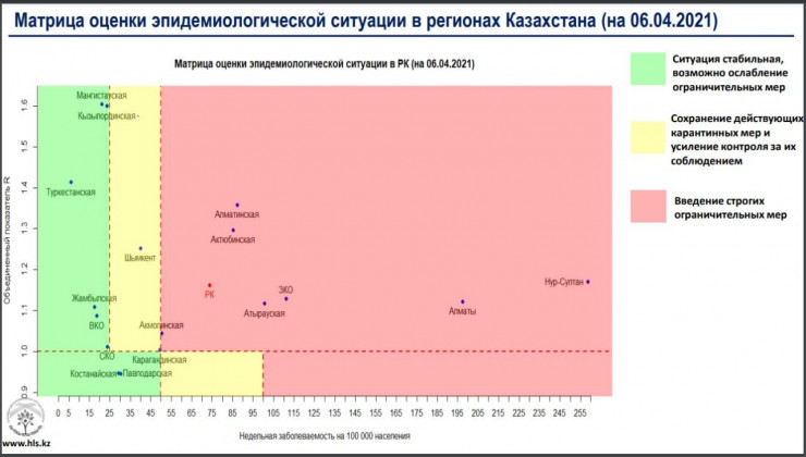 По его данным, на 6 апреля в "красной" зоне находятся 7 регионов: Нур-Султан, Алматы, Атырауская, ЗКО, Акмолинская, Алматинская и Актюбинская области.