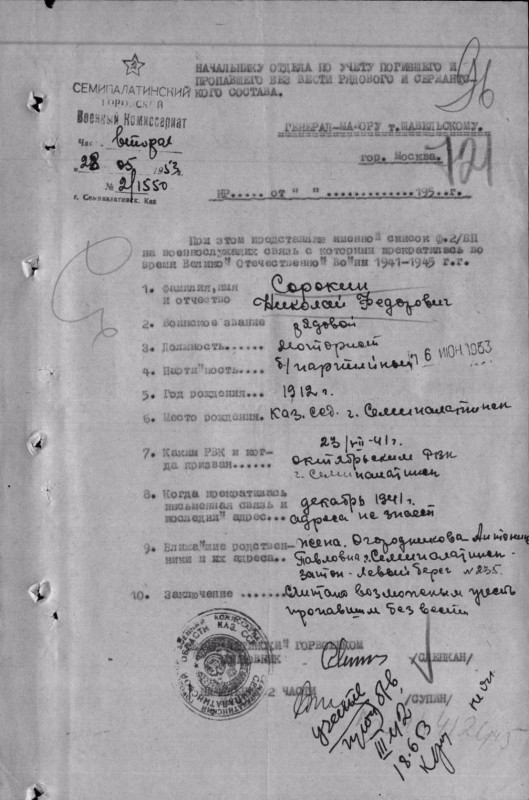 В это же время в Эстонии найдены останки еще одного солдата - Сорокина Николая Федоровича, 1912 года рождения, уроженца Семипалатинска. Личность его установлена по медали "За отвагу". В 1953 году его также разыскивала жена, которая на тот момент проживала по адресу Затон- Левый берег, 235. Об этом свидетельствует установленная поисковиками анкета-опросник супруги Сорокина.