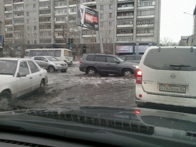 В Уральске днем уже по весеннему тепло, а ночью бывает легкий морозец. Поэтому на самых "ходовых" дорогах влага за ночь вымерзает и центральные улицы практически все уже без снега. Местами виднеется даже сухой асфальт. На второстепенных дорогах - каша из снега с водой или огромные лужи. Эти "моря разливанные", как показывает практика прошлых лет, исчезнут не раньше, чем к середине марта.