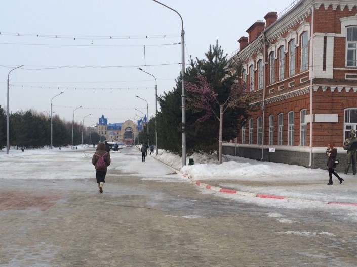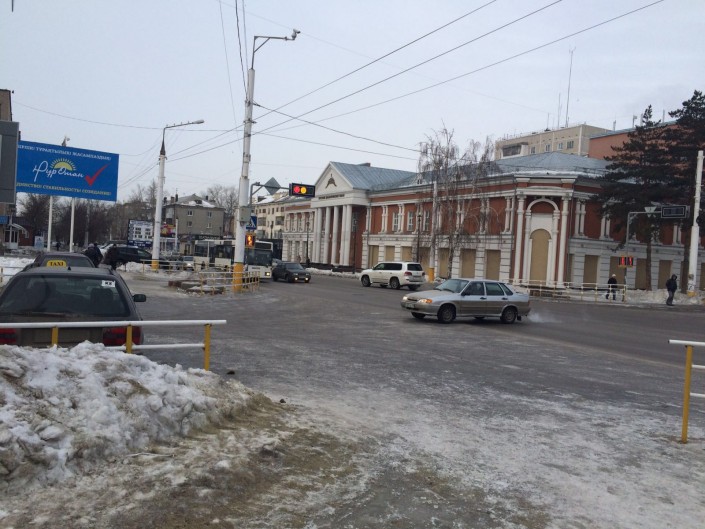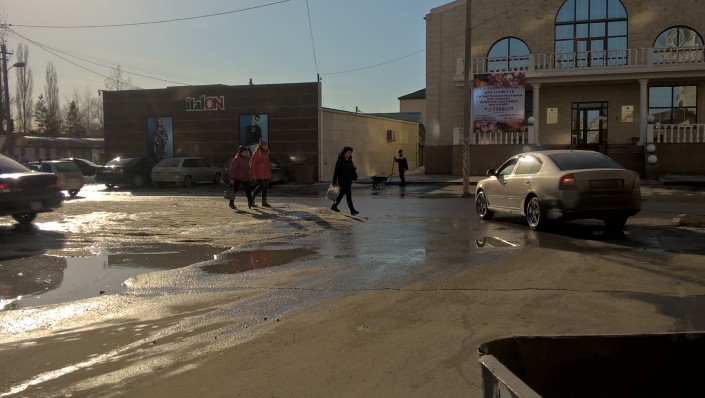 Между тем, в Актобе пасмурно. Утро морозное - минус 3. Но подмерзшие за ночь лужи все еще таят опасность для водителей. И, несмотря на непривычно безветренную погоду, актюбинцы одеты так же тепло, как и всегда в феврале.