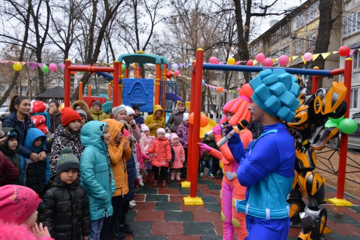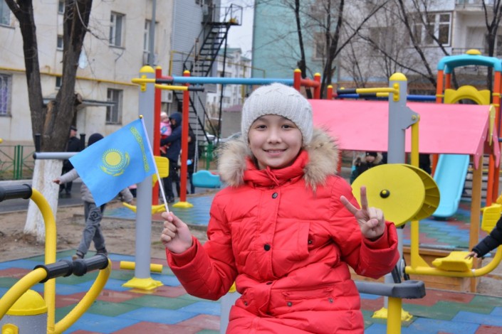 В Абайском районе тоже праздник. Здесь во дворах домов № 141, 141а, 141б была сдана в эксплуатацию современная детская спортивная площадка. В целом по району было благоустроено 10 дворов. В планах - благоустройство еще 40.