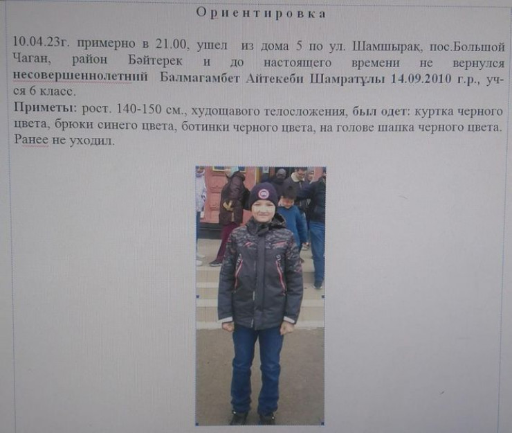 По информации пресс-службы Департамента полиции ЗКО, 10 апреля в 21:00 из дома в селе Большой Чаган района Байтерек ушел и до настоящего времени не вернулся ученик 6-го класса Айтекеби Балмагамбет 2010 года рождения. Мальчик был одет в куртку черного цвета, синие брюки, черную шапку и ботинки черного цвета.