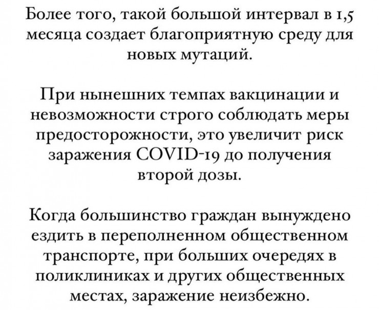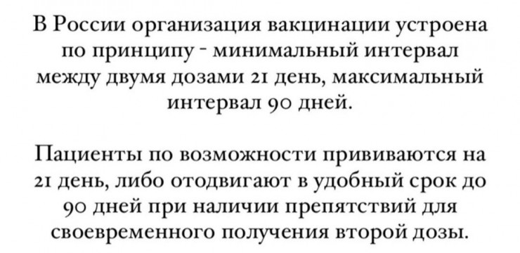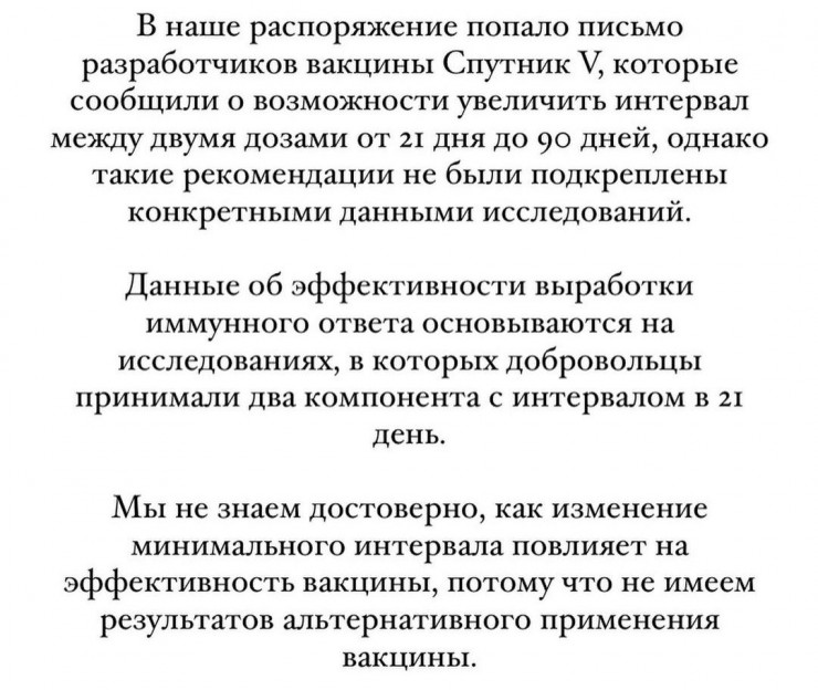 Согласно последнему постановлению главного санитарного врача, интервал между двумя дозами увеличен до 45 дней (ранее был 21 день), а в целом допускается вакцинация вторым компонентом "Спутника V" в течение 90 дней. Однако медики не согласны с этим решением. На странице независимого научно-медицинского сообщества в Instagram появилось срочное обращение.