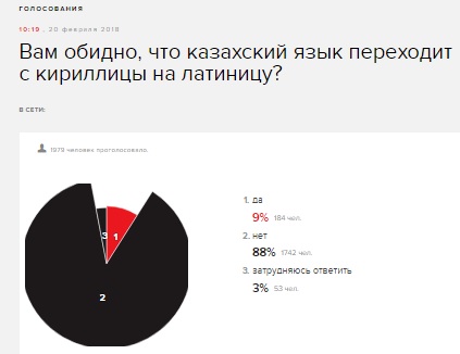 Публикация о латинице на NEWSru.com вышла под заголовком "Назарбаев, стремясь уйти от влияния России и Турции, заменил в новом казахском алфавите апострофы на акуты". А на сайте "Эха Москвы" появилось голосование с вопросом "Вам обидно, что казахский язык переходит с кириллицы на латиницу?". По данным на 15.50 по времени Астаны, 88 процентов опрошенных в Сети ответили "Нет".