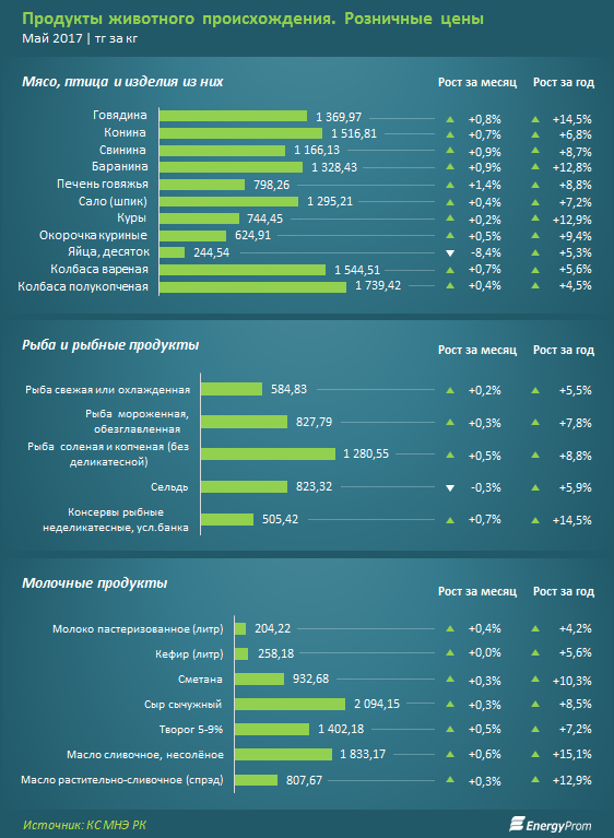 А вот в отношении цен на мясо и птицу ситуация обратная. Цены на них выросли к апрелю не более чем на 1 процент по всем категориям, кроме говяжьей печени, подорожавшей на 1,4 процента. Яйца даже показали удешевление на 8,4 процента за месяц. Примечательно, что именно яйца дешевеют месяц от месяца с начала года, после пика в декабре 2016, когда десяток стоил более 300 тенге.