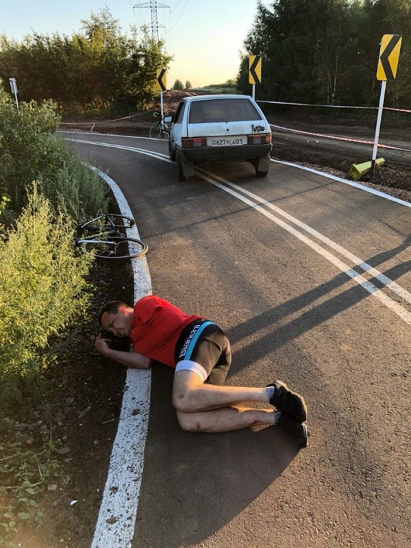"Прилично развив скорость, мы были изрядно удивлены выскочившей из-за поворота девятке, и мы с Чиной резко крутим руль в сторону, и просто падаем в кювет, а вот Сашку машина встретила в лоб. Падая в кювет, я смотрел, как он шлемом бьется о капот, делает сальто с велосипедом и улетает в кювет. Мы подбежали и честно подумали, что все. Ему страшно повезло, что удар пришелся в шлем. Мы оказали первую помощь и резко начинаем звонить в скорую и ГАИ. Скорая, с учетом того где мы были, приехала быстро. Диагностировали перелом плеча, ребер , ссадины, ушибы и так далее, 2 месяца в гипсе", - написал Хасенов в Facebook.