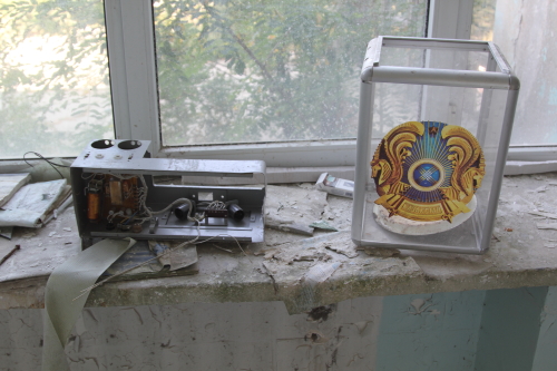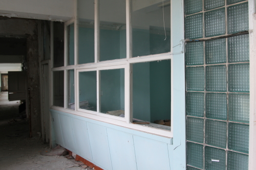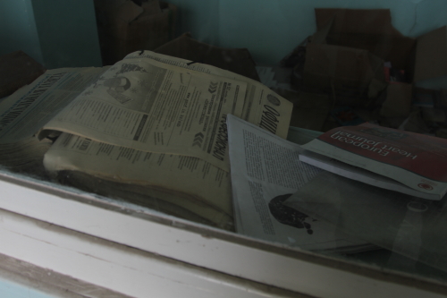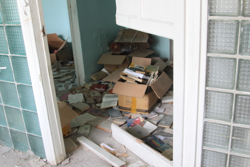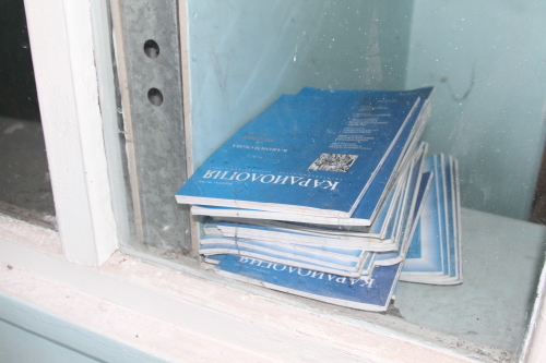 За стеклом регистратуры видны книги, которые оставили прежние обитатели здания.