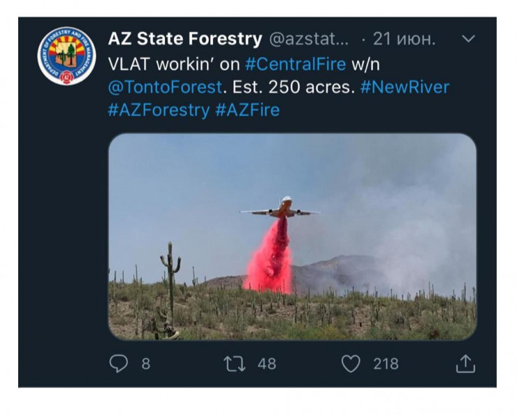 "Специалистами МВД в ходе мониторинга социальных сетей выявлены публикации, содержащие видеоматериалы, на которых самолеты сбрасывают вещество красного цвета над пустынной местностью. Авторы этих публикаций утверждают, что кадры сняты в Казахстане. Следственным департаментом МВД по факту распространения заведомо ложной информации начато досудебное расследование по статье 274 Уголовного кодекса РК. Министерством исследована полная версия видеозаписи, которая показала, что самолет в видеоролике - это Tanker Air Carrier 914, задействованный в тушении пожаров в США", - объяснили в пресс-службе МВД.