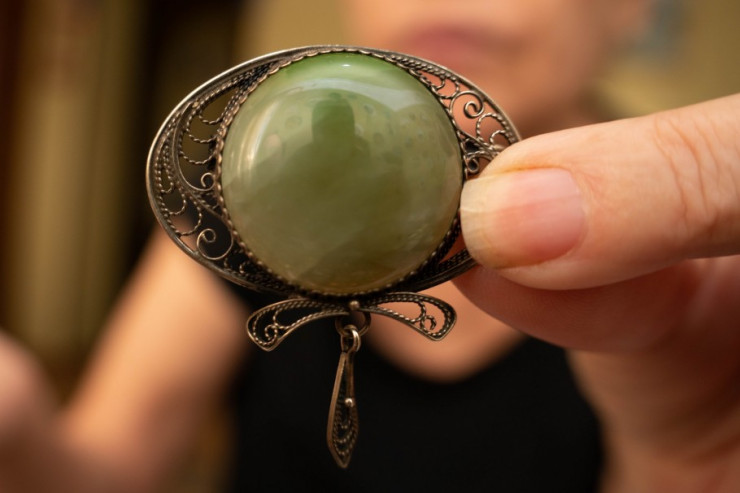 А вот эта брошь с зеленым поделочным камнем, предполагает Наталья, возможно, родом из 30-х.