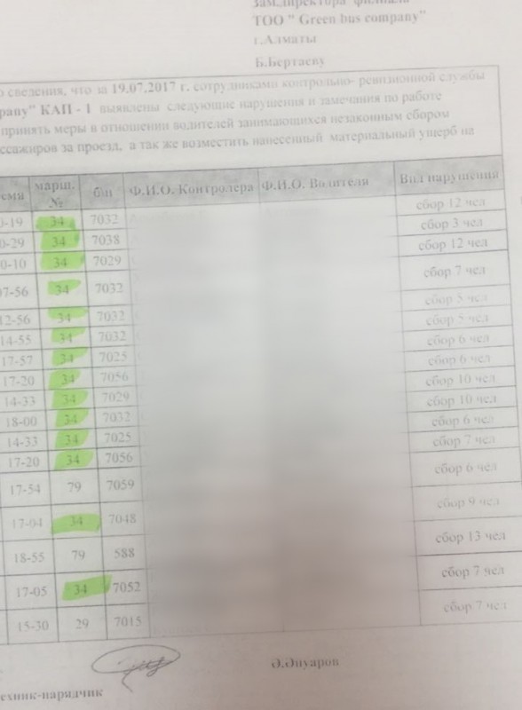 По его информации, водители, которые бастуют, не пробивают билеты пассажирам, которые платят наличными. Более 80 процентов нарушений невыдачи билетов приходится на 34 маршрут. Баурджан Кулишев поделился отчетами контролеров Green Bus Company о нарушениях водителями автобусов.