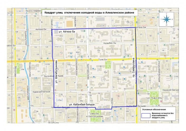 "С 22 часов 16 октября до 6 часов утра 17 октября будет прекращена подача холодной воды в жилые дома и иные объекты, расположенные на территории Алмалинского района в контуре улиц Кабанбай батыра -Айтеке би - Сейфуллина - Шагабутдинова", - говорится в сообщении "Алматы Су".