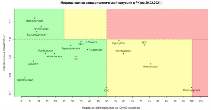 Согласно матрице оценки эпидемиологической ситуации в регионах Казахстана на 20 февраля 2021 года ни один регион не остался в "красной" зоне по распространению коронавируса, передает корреспондент Tengrinews.kz.