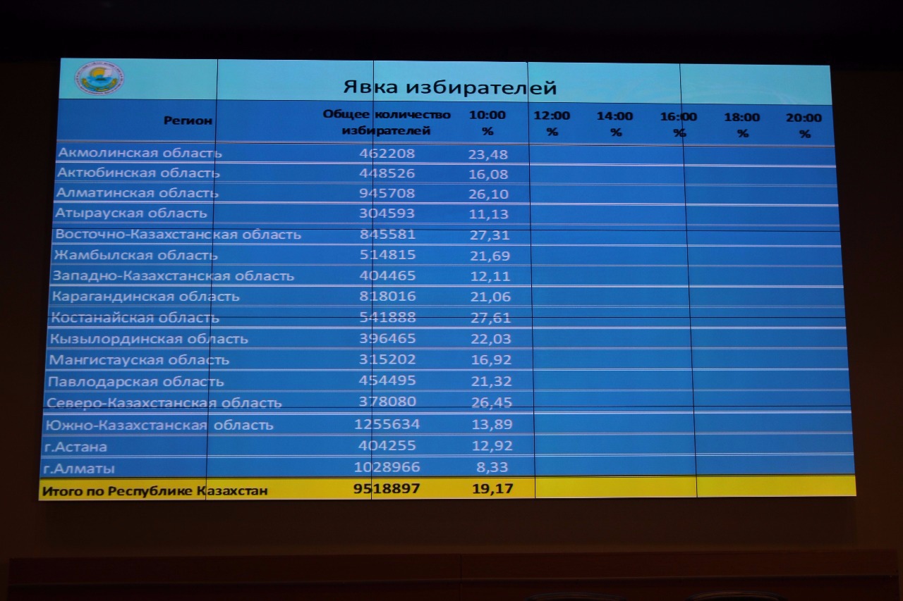 На выборах Президента Казахстана на 10 часов утра времени Астаны проголосовали 19,17 процента от общего количества избирателей, сообщает корреспондент Tengrinews.kz со ссылкой на члена Центральной избирательной комиссии Ляззат Сулеймен.