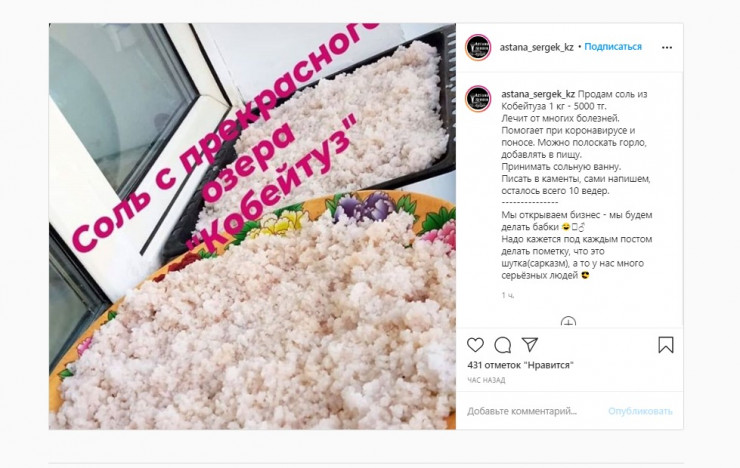 Отметим, что в Сети появилось шуточное объвление о продаже соли из озера Кобейтуз. Подобное объявление казахстанцы восприняли с негативом.