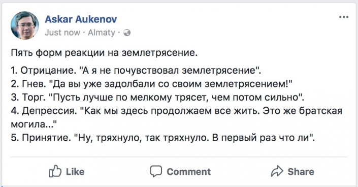 Пользователи социальных сетей разместили шуточные посты о произошедшем землетрясении в Алматы, передает корреспондент Tengrinews.kz.