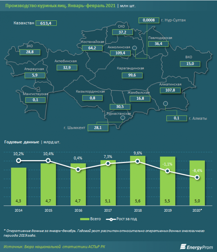 Половина всего производства приходится на три региона: Акмолинскую (109,4 миллиона яиц, минус 18,6 процента за год), Алматинскую (107,8 миллиона яиц, минус 24,7 процента) и Карагандинскую (99,6 миллиона яиц, минус 1,4 процента) области.