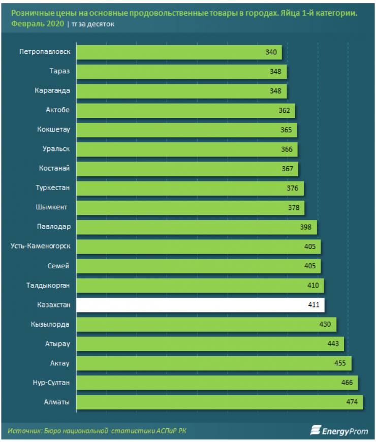 Сообщается, что в феврале 2021 года цены на яйца первой категории выросли сразу на 32,9 процента в годовой динамике и на 3,6 процента - за месяц. На базарах и в магазинах страны их стоимость достигала 411 тенге за десяток.
