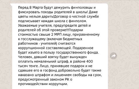 В социальных сетях казахстанцы активно распространяют сообщение о запрете на подарки для учителей к 8 Марта. Якобы появился запрет в школах, что нельзя к празднику дарить учителям цветы.
