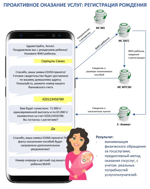 АО "Национальные информационные технологии" совместно с НАО "Государственная корпорация "Правительство для граждан" и соответствующими государственными органами планирует перейти к проактивному оказанию услуги "Рождение ребенка", чтобы максимально исключить хождение граждан по кабинетам, передает корреспондент Tengrinews.kz. Услуга будет выглядеть следующим образом: