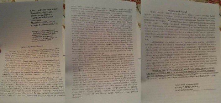 (...) Мен де "отыз үшінші болып арыз жазғанда не өзгереді?" деп, тиісті органдарға шағымданбадым. Оның үстіне үй-күйсіз далада есеңгіреп жүрген соң біреудің соңына майшам алып түсетіндей жағдайда болмадым. Енді осы арыз жазбағаным өзіме пәле болып жабысып отыр. Шынтуайтында, мен және менің туыстарым - жәбірленушілерміз. (...)", - делінген хатта.