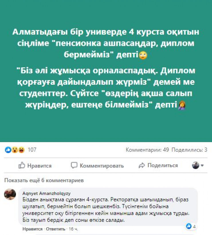 "Алматыдағы бір университетте 4-курста оқитын сіңліме "зейнетақы жинағын ашпасаңдар, диплом бермейміз" депті. Студенттер "біз әлі жұмысқа орналаспадық, диплом қорғауға дайындалып жатырмыз" деген. "Өздерің ақша салып жүріңдер, ештеңе білмейміз" деп жауап беріпті", - деп жазды ол.