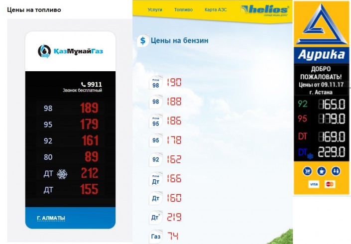 Как отмечается на сайте компании, литр зимнего дизтоплива продается по 212 тенге. Летнее дизельное топливо стоит 155 тенге. На АЗС сети Helios литр зимнего дизтоплива стоит 219 тенге. На заправках компании "Аурика" зимнее дизельное топливо стоит 229 тенге.