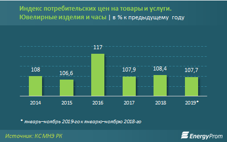 По итогам 11 месяцев в стране произвели ювелирных изделий на 668,5 миллиона тенга против 648,1 миллиона годом ранее. Впрочем, по данным Комитета по статистике, индекс промышленного производства в секторе составил всего 96,4 процента, что говорит о спаде выпуска в реальном выражении.