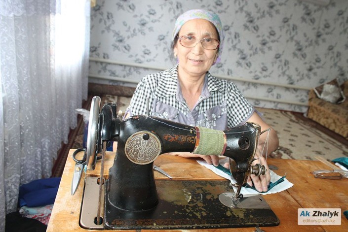 "Рукоделие передалось нам от наших предков. Шью на старой швейной машинке моей бабушки", - говорит Акзира Абуева. Акзира апай валяет войлок, шьет лоскутные одеяла, корпе. Ткани и вату покупает в Атырау.