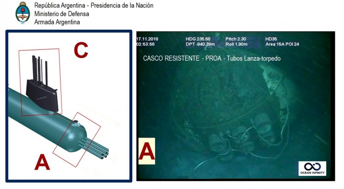 Между тем ВМС Аргентины опубликовали фото подводной лодки "Сан-Хуан". На кадрах показаны разрушенная часть корпуса и движущий винт. Также были идентифицированы другие части подводной лодки меньших размеров и форм, которые соответствуют носовой части и корме.