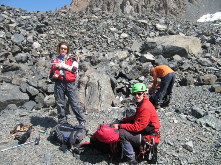 "Ну все, пора вставать. "Аня, Аня!" - Саша смотрел на меня в недоумении. - "Ботинок где?" Конечно, я не знала, где ботинок. Мы обшарили площадку и поняли, что его сорвало с ноги во время падения. Саша снял свою обувь, а сам три часа спускался по морене босиком", - поделилась она.
