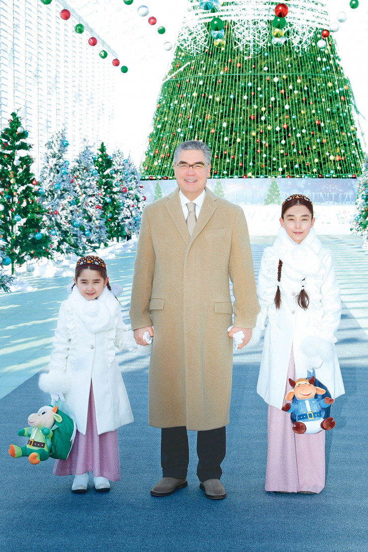 Бердымухамедов слепил снеговика и пришел с внучками на елку © tdh.gov.tm