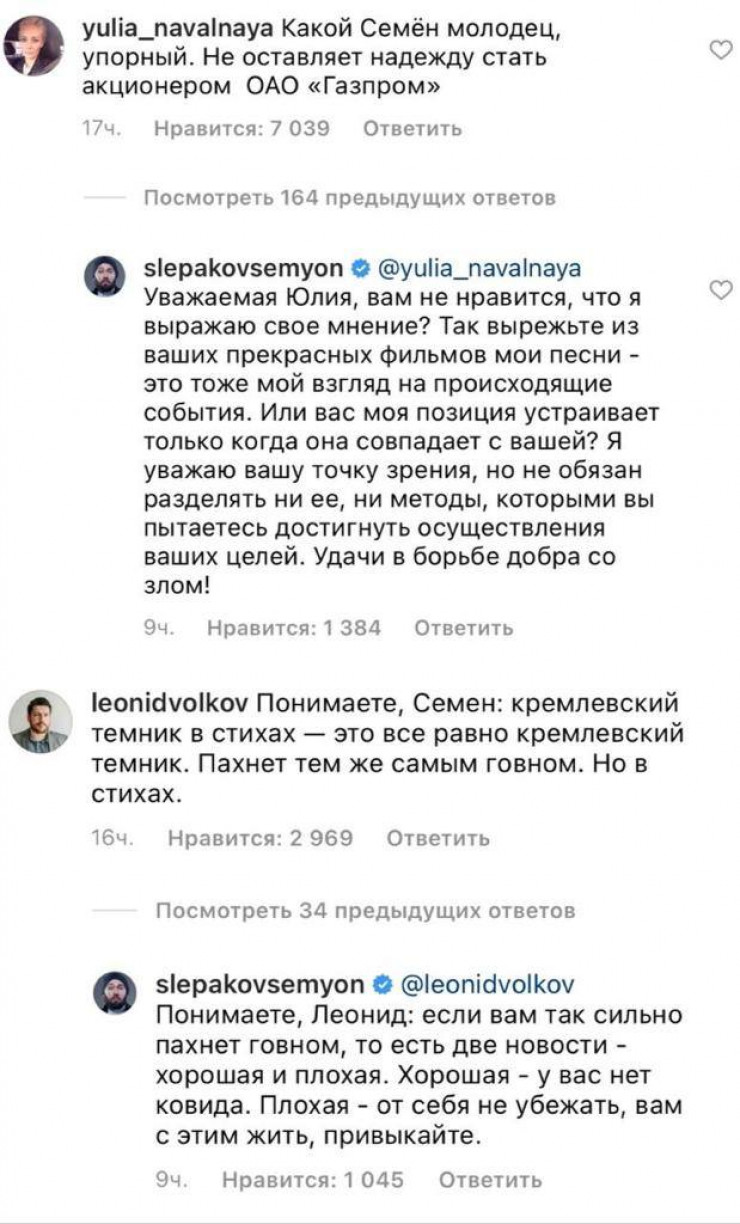В ответ Юлия Навальная и бывший руководитель предвыборного штаба Навального Леонид Волков начали нападки на юмориста. Так, жена Навального написала Слепакову, что тот, наверное, стремится стать акционером Газпрома, а Волков обвинил шоумена, что тот якобы написал стихотворение по заказу из Кремля.