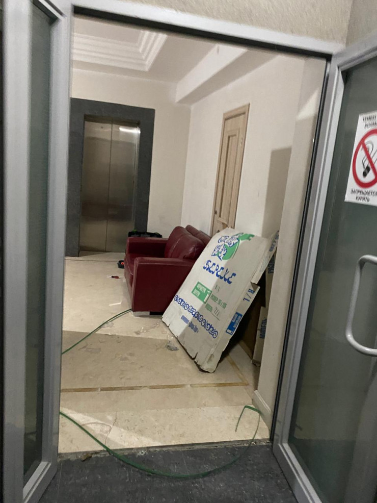 В подъезде сильно пахнет порохом. На 17-м этаже вынесена мебель, по всей видимости, из квартиры стрелка. Однако на его этаже тихо и спокойно, будто никто не живет.