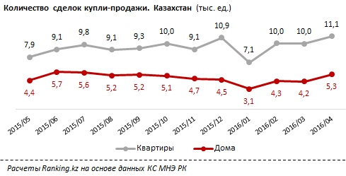 "Количество сделок купли-продажи в сегменте квартир в многоквартирных домах в апреле выросло на 9,5 процента, составив 11 106 единиц. Незначительно увеличились (на 1 процент за год) продажи индивидуальных домов (5 310 единиц). Традиционно на долю купли-продажи квартир приходится примерно вдвое больше сделок, чем на дома", - говорится в распространенном сообщении.