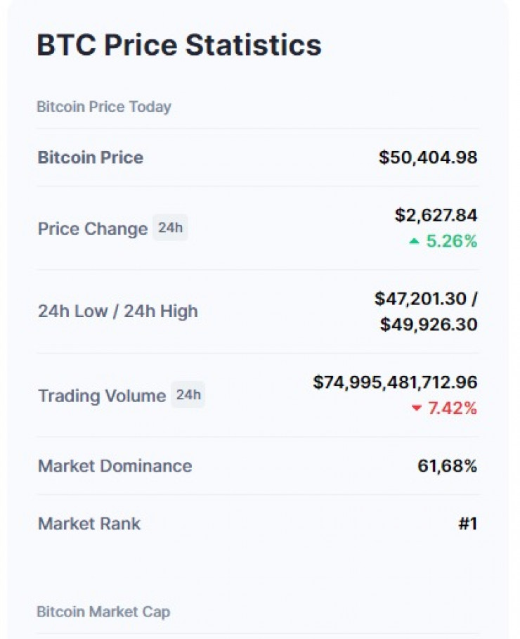 Как отмечает РИА Новости, на крупнейшей по объему торгов криптовалютами бирже Binance биткоин по состоянию на 18.30 по времени Нур-Султана рос в цене на 5,3 процента - до 50,1 тысячи долларов. Динамика приводится за сутки.