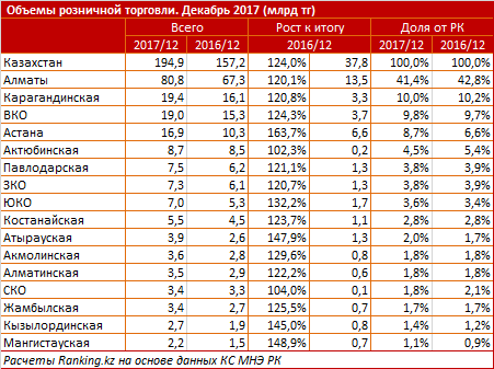 Также среди лидеров - торговые центры и магазины Карагандинской области (19,4 миллиарда тенге, +20,8 процента за год), ВКО (19 миллиарда тенге, +24,3 процента) и столицы (16,9 миллиарда тенге, сразу +63,7 процента год-к-году - это самые высокие темпы роста по РК).