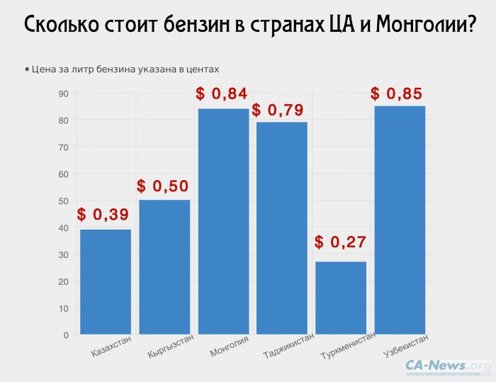 В странах Центральной Азии и Монголии самый дешевый бензин продают в Туркменистане и Казахстане - 0,27 доллара за литр и 0,39 доллара за литр соответственно. Такая статистика приводится на сайте globalpetrolprices.com, сообщает CA-NEWS. Самый дорогой бензин в Узбекистане (0,85 доллара за литр) и Монголии (0,84).