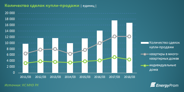 Еще 12,9 процента пришлось на Алматы (2,2 тысячи сделок, сразу на 16 процента меньше, чем год назад) и 10,9 процента - на Карагандинскую область (1,8 тысячи сделок, на 4,8 процента меньше, чем в марте 2017).