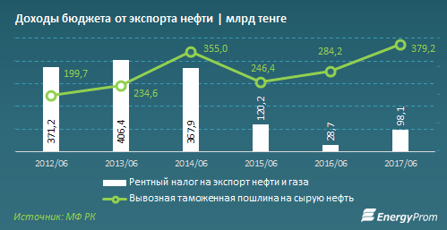 Доход бюджета от экспорта нефти увеличился на 53 процента к первому полугодию 2016 года и составил 477,2 миллиарда тенге. В том числе сборы за вывозную таможенную пошлину на сырую нефть увеличились на 33 процента и составили 379,2 миллиарда тенге. Рентный налог на экспорт, идущий в Нацфонд, увеличился почти в 3,5 раза и составил 98,1 миллиарда тенге. Доля доходов страны от экспорта нефти за год выросла с 11 до 15 процентов.
