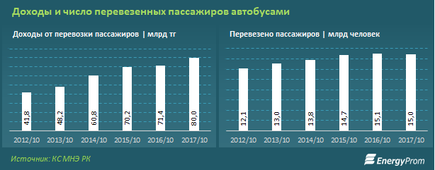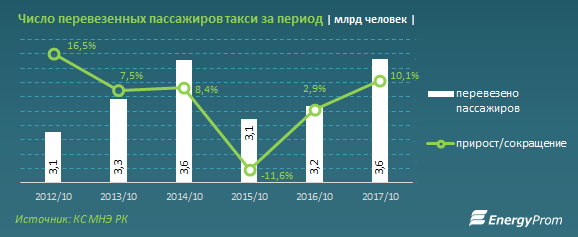 Также отмечается, что спрос на услуги такси в РК в этом году увеличивается, в то время как объем перевозок пассажиров автобусами показывает хоть и небольшое, но сокращение - за январь-октябрь было перевезено на 0,7 процента, или на 99,8 миллиона человек, меньше, чем год назад. При этом, несмотря на указанное сокращение перевозок пассажиров автобусами, доходы в секторе в этом году выросли сразу на 12 процентов.