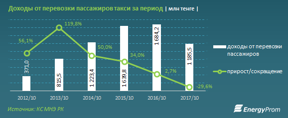 В частности, доходы от перевозки такси пассажиров за десять месяцев 2017 года составили 1,2 миллиарда тенге, впервые сократившись с 2012 года. По сравнению с суммой, заработанной за аналогичный период прошлого года, доходы уменьшились на 29,6 процента, или на 498,7 миллиона тенге.
